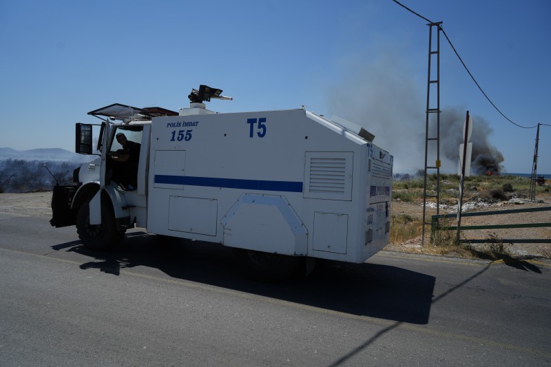 İlçe Emniyet Müdürlüğü bünyesinde görevli bir Toplumsal Olayla Müdahale Aracı (TOMA) ve iş makinelerinin de kullanıldığı çalışmalar kapsamında ekiplerin soğutma çalışması sürüyor.