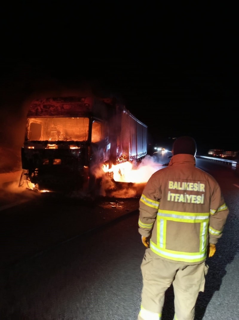 Balıkesir'den geçen İstanbul-İzmir otoyolunda meydana gelen yangınında tır kullanılamaz hale gelirken, yanan tır otoyol kenarında bulunan otluk alanda yangına sebep oldu.
