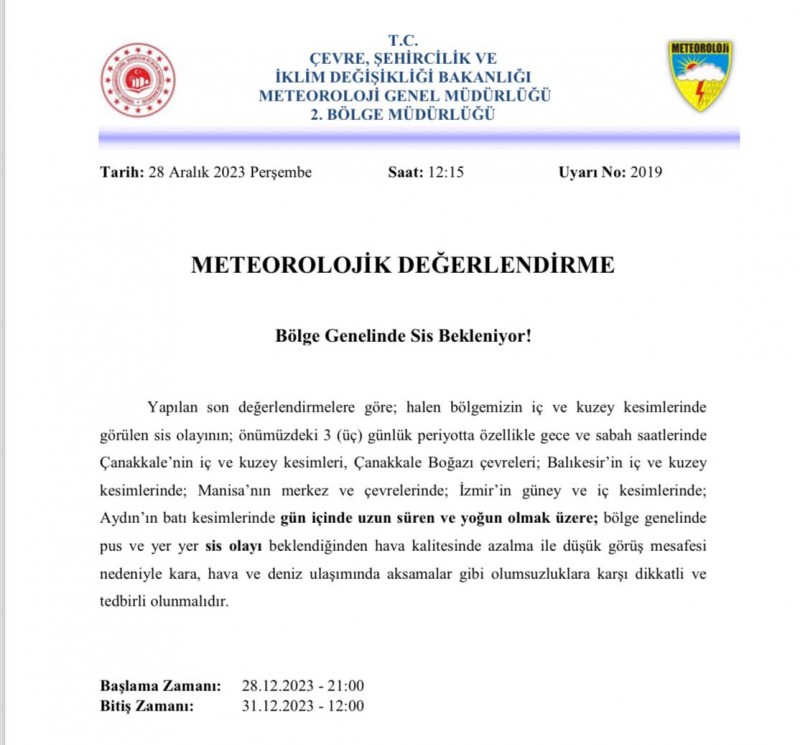 Sabah saatlerinden itibaren şehir üzerinde etkisini göstermeye başlayan yoğun sis, akşam saatlerinde de etkisini artırdı. Yoğun sis nedeniyle Balıkesir’in çeşitli noktalarında görüş mesafesi 10-20 metreye kadar düşerken, Balıkesir Valiliği 3 gün boyunca şehir üzerinde etkisini gösterecek olan yoğun sis için vatandaşları ve sürücüleri uyardı. Balıkesir Valiliğinden yapılan uyarıda, “Bölge genelinde pus e yer yer sis olayı beklendiğinden hava kalitesinde azalma ile düşük görüş mesafesi nedeniyle kara, hava ve deniz ulaşımında aksamalar gibi olumsuzluklara karşı dikkatli ve tedbirli olunmalıdır” ifadeleri yer aldı.