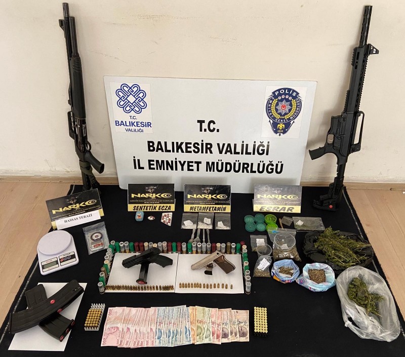 Balıkesir Cumhuriyet Başsavcılığı talimatıyla İl Emniyet Müdürlüğü Narkotik birimlerince uyuşturucu operasyonu gerçekleştirildi. Edinilen bilgiye göre, uyuşturucu madde ticareti yaptığı tespit edilen sokak satıcılarına yönelik Balıkesir il merkezinde ve ve Bigadiç ilçesinde yapılan eş zamanlı operasyonda toplam 10 şüpheli gözaltına alındı. Özel harekat ekiplerinin de katıldığı operasyonda çok sayıda uyuşturucu madde ve silah ele geçirildi. Ekipler evlerde yaptıkları aramalarda, 4 bin 464 adet sentetik ecza hap, 210.59 gram metamfetamin, 201.07 gram esrar, 201.39 gram kenevir tohumu, 17.85 gram sentetik kannabinoid (bonzai), 3 adet ruhsatsız tabanca, 1 adet kurusıkı tabanca, 141 adet fişek, 2 adet pompalı tüfek, 47 adet kartuş, 2 hassas terazi, 4 adet uyuşturucu madde içiminde kullanılan cam aparat, 9 adet sikke, 2 adet esrar öğütücü ve suçtan elde edildiği değerlendirilen para ele geçirildi.