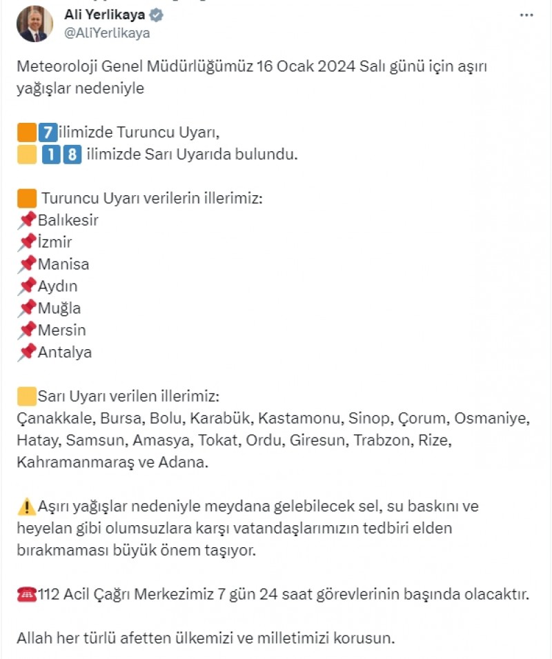 İçişleri Bakanı Ali Yerlikaya, X hesabından yaptığı paylaşımda yarın için Balıkesir başta olmak üzere, İzmir, Manisa, Aydın, Muğla, Mersin, Antalya illerinde turuncu kodlu uyarıda bulundu. Çanakkale, Bursa, Bolu, Karabük, Kastamonu, Sinop, Çorum, Osmaniye, Hatay, Samsun, Amasya, Tokat, Ordu, Giresun, Trabzon, Rize, Kahramanmaraş ve Adana illeri için ise sarı kodlu uyarıda bulundu. Bakan Ali Yerlikaya, sosyal medya hesabında vatandaşların tedbirli olmasını istedi. Bakan Yerlikaya’nın açıklaması ise şu şekilde; “Aşırı yağışlar nedeniyle meydana gelebilecek sel, su baskını ve heyelan gibi olumsuzlara karşı vatandaşlarımızın tedbiri elden bırakmaması büyük önem taşıyor. 112 Acil Çağrı Merkezimiz 7 gün 24 saat görevlerinin başında olacaktır. Allah her türlü afetten ülkemizi ve milletimizi korusun.”