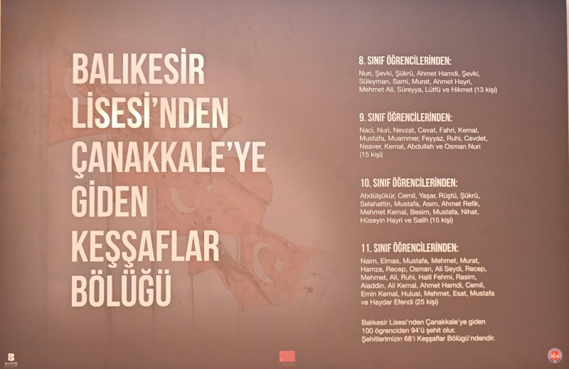 Balıkesir Büyükşehir Belediyesi le Balıkesirliler Derneği iş birliğinde Birinci Dünya Savaşı’nda şehit olan 94 Balıkesir Liseli Keşşafın anılarının yaşatılacağı ‘Balıkesir Liseli Keşşaflar Müzesi’ müzesinin açılışı gerçekleştirildi. Açılışta konuşan Başkan Ahmet Akın “Tarihimize, kültürümüze sahip çıkmak için seferberlik başlattık. Kuvayı Milliye’nin başşehri olan Balıkesir’i, Türkiye’nin parlayan yıldızı yapacağız.” dedi.