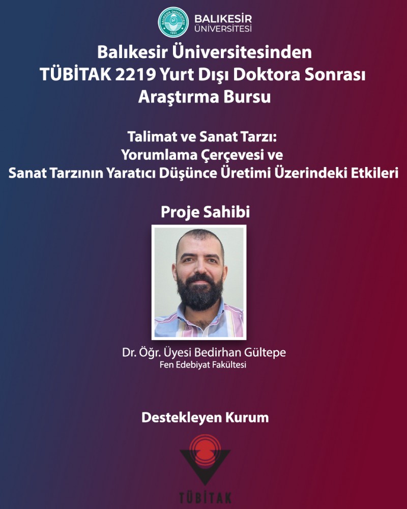 Balıkesir Üniversitesi (BAÜN) Fen-Edebiyat Fakültesi Psikoloji Bölümü akademisyenlerinden Dr. Öğr. Üyesi Bedirhan Gültepe, “Talimat ve Sanat Tarzı: Yorumlama Çerçevesi ve Sanat Tarzının Yaratıcı Düşünce Üretimi Üzerindeki Etkileri” başlıklı projesiyle TÜBİTAK 2219 Yurt Dışı Doktora Sonrası Araştırma Bursu almaya hak kazandı.