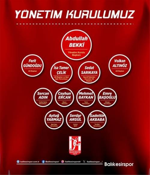 Balıkesirspor'da yapılan toplantıda Başkan Abdullah Bekki Yönetim Kurulu Başkanı olurken, Ferit Gündoğdu, Volkan Demiröz As Başkan, İsa Tamer Çelik As Başkan ve İdari İşler Sorumlusu, Sedat Sarıkaya Sportif İşlerden sorumlu As Başkan ve Sercan Adın, Ceyhun Ercan, Mehmet Baykan, Emre Başoğlu, Aytuğ Yarmaz, Serdar Akgül'e çeşitli sorumluluklar verildi. Taraftarlardan sorumlu olarak da Sadettin Akbaba görev aldılar.