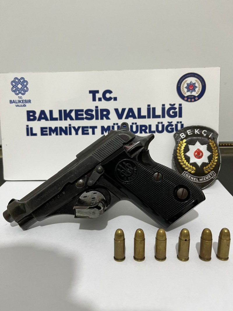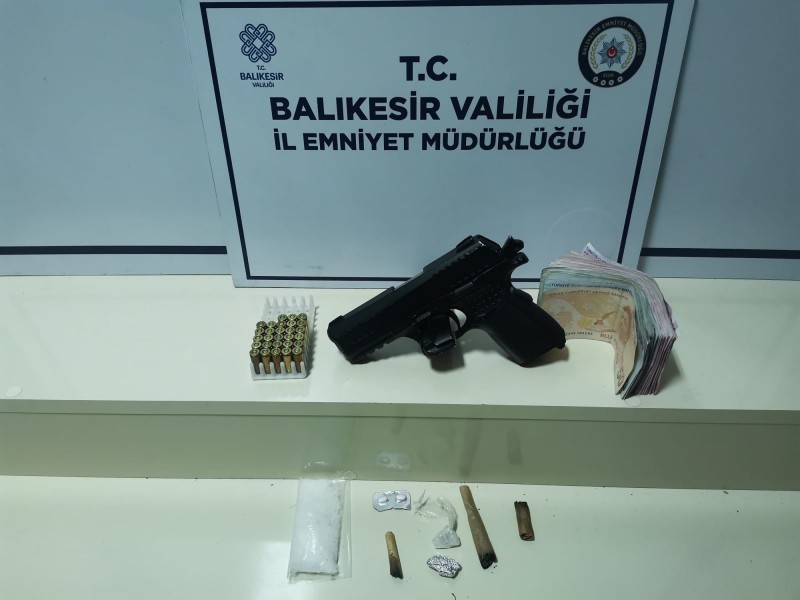 Yapılan kontroller sonucunda suç unsuru olarak kabul edilen; 3 adet ruhsatsız tabanca, 1 adet kuru sıkı tabanca, 9 adet ruhsatsız tüfek, 21 adet 7,65mm tabanca fişeği, 238 adet 9mm tabanca fişeği, 28,4 gram metanfetamin, 3,34 gram tütünle karıştırılmış esrar, 6.640 lira para, 5,5 Lt sahte rakı, 5 Lt etil alkol, 3 Lt sahte viski, 1,5 Lt sahte votka ele geçirildi. (İHA)