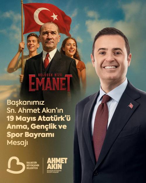 Balıkesir Büyükşehir Belediye Başkanı Ahmet Akın 19 Mayıs Atatürk’ü Anma, Gençlik ve Spor Bayramı dolayısıyla bir kutlama mesajı yayınladı. 19 Mayıs 1919’un, bağımsızlık ve egemenlik yolunda topyekûn yürüyüşün ilk adımı olduğunu belirten Başkan Akın mesajında “19 Mayıs Atatürk'ü Anma, Gençlik ve Spor Bayramımız da dâhil tüm milli emanetlerimizi hak ettiği biçimde sahiplenecek ve güzel yarınları gençlerimizle birlikte inşa edeceğiz.” sözlerine yer verdi.