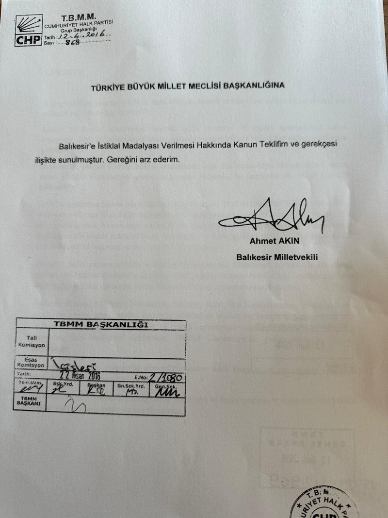 10 yıllık milletvekilliği sürecinde Balıkesir’e İstiklal Madalyası verilmesi hakkında 12 Nisan 2016 ve 24 Mayıs 2019 tarihlerinde Türkiye Büyük Millet Meclisine (TBMM) kanun teklifleri sunan Başkan Akın, Balıkesir Büyükşehir Belediye Başkanı olarak göreve başlar başlamaz ilk meclis toplantısında da “İstiklal Madalyası, Balıkesir’in hak ettiği bir onurdur” diyerek kararlılığını vurgulamıştı. Kuvayımilliye’nin başkenti Balıkesir’e bu tarihi onurun verilmesinin artık gecikmemesi gerektiğini vurgulayan Başkan Akın, siyaset üstü bir tavırla kentin tüm bileşenlerinin ortak hareket etmesi gerektiğini dile getirdi.