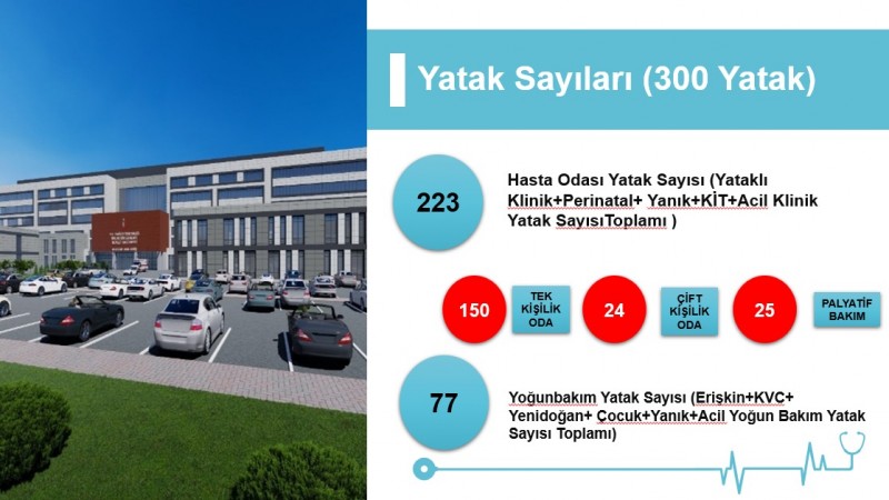 300 Yataklı Edremit Devlet Hastanesi projesinde; 223 Hasta Odası Yatak Sayısı, 13 Ameliyathane, 77 Yoğun Bakım Ünitesi, 100 Poliklinik, KVC / Kalp Merkezi ve Acil İniş Alanı yer alıyor.