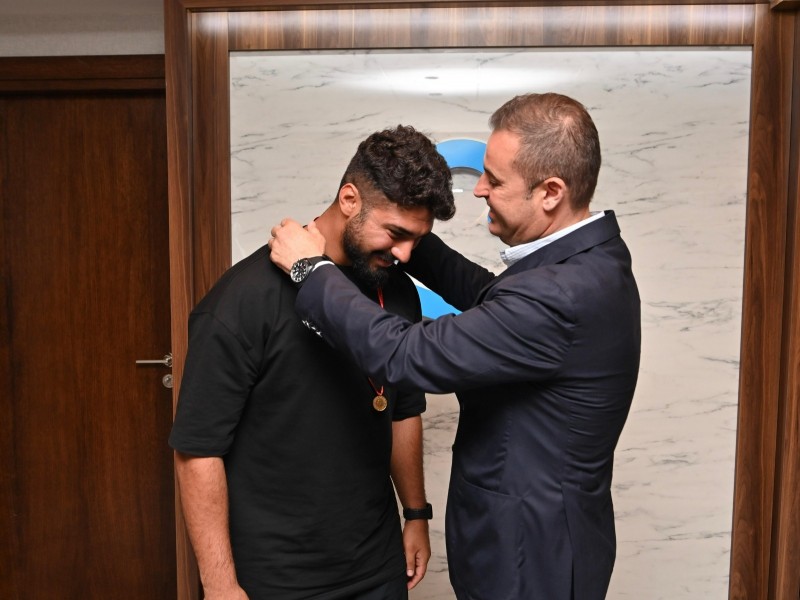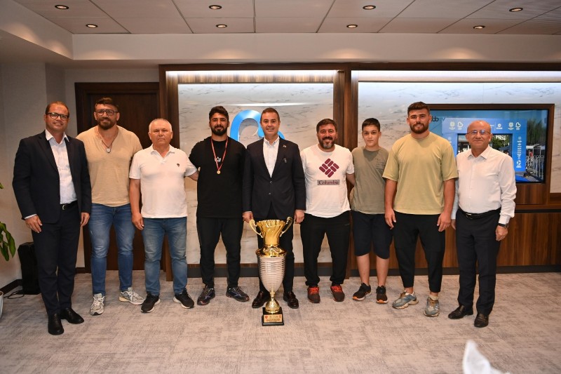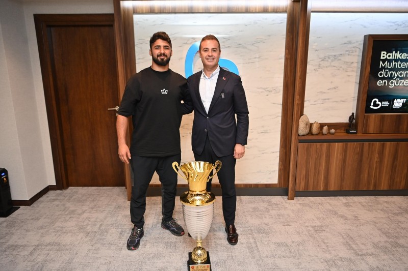 Balıkesir Büyükşehir Belediye Başkanı Ahmet Akın, 64. Geleneksel Kurtdereli Mehmet Pehlivan Yağlı Güreşleri’nde rakibi Erkan Taş’ı tuş ederek ‘Altın Kemer’ kazanan Başpehlivan Enes Doğan’ı makamında ağırladı. Ziyarette Balıkesir’i 2024 Paris Olimpiyatlarında başarıyla temsil ederek bronz madalya kazanan Balıkesirli milli boksör Esra Yıldız Kahraman da yer aldı. 64.Geleneksel Kurtdereli Mehmet Pehlivan Yağlı Güreşleri Başpehlivanlığını kazanan Enes Doğan, hocası Kemal Yılmaz ve ekibi ile birlikte başarısını Başkan Ahmet Akın ile paylaştı. Gösterdiği başarıdan dolayı Başpehlivan Enes Doğan’ı tebrik eden Başkan Akın, bir sonraki hedefinin Balıkesir’den başpehlivan çıkarmak olduğunu söyledi. Gelecek yıl düzenlenecek olan Kurtdereli Mehmet Pehlivan Yağlı Güreşleri öncesi tribünlerin yenileneceği müjdesini veren Başkan Ahmet Akın “Altyapıda eksiklikleri hızlıca tamamlayacağız. Tribünlerimizi büyüteceğiz.” dedi.