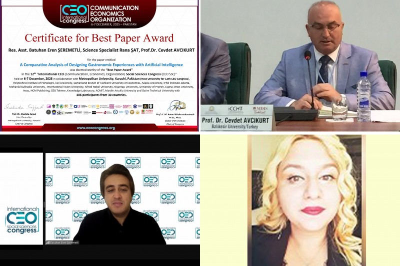 Balıkesir Üniversitesi (BAÜN), uluslararası platformlarda kazandığı akademik başarılarla adından söz ettirmeyi sürdürüyor. Balıkesir Üniversitesi öğrencisi ve Adıyaman Üniversitesi Turizm Fakültesi Turizm Rehberliği Bölümü akademisyeni Arş. Gör. Batuhan Eren Şeremetli, Balıkesir Üniversitesi öğrencisi Bilim Uzmanı Rana Şat ve Turizm Fakültesi Turizm İşletmeciliği Bölümü akademisyenlerinden, Rektör Yardımcısı Prof. Dr. Cevdet Avcıkurt, tarafından sunulan “A Comparative Analysis of Designing Gastronomic Experiences With Artificial Intelligence” başlıklı bildiri, 6-7 Aralık 2025 tarihleri arasında Pakistan’ın Karachi kentinde Metropolitan University ev sahipliğinde düzenlenen ve 30 ülkeden 306 bildirinin yer aldığı 12th International CEO Social Sciences Congress’te “Best Paper Award / En İyi Bildiri” ödülü ile ödüllendirildi.