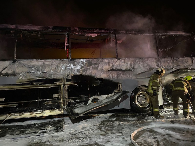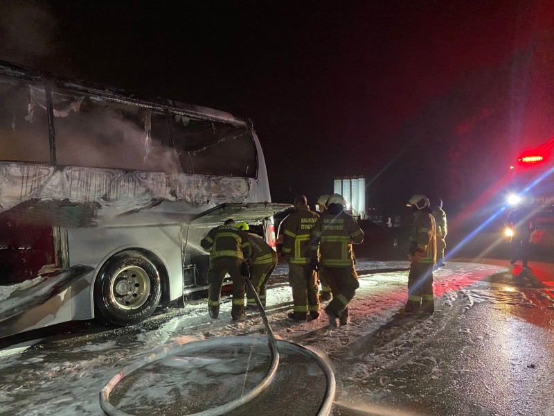 Bandırma ilçesinde meydana gelen olayda bir yolcu otobüsü, Gönen Köprüsü üzerinde arızalandı. Sürücü ve görevlilerin dışında kimsenin bulunmadığı otobüs, saniyeler içinde alev topuna döndü. Yoldan geçenler akşam karanlığında yükselen alevleri cep telefonlarıyla görüntüledi. İtfaiye ekiplerinin müdahalesiyle yangın söndürülürken, otobüsün ise küle döndüğü görüldü. (İHA)