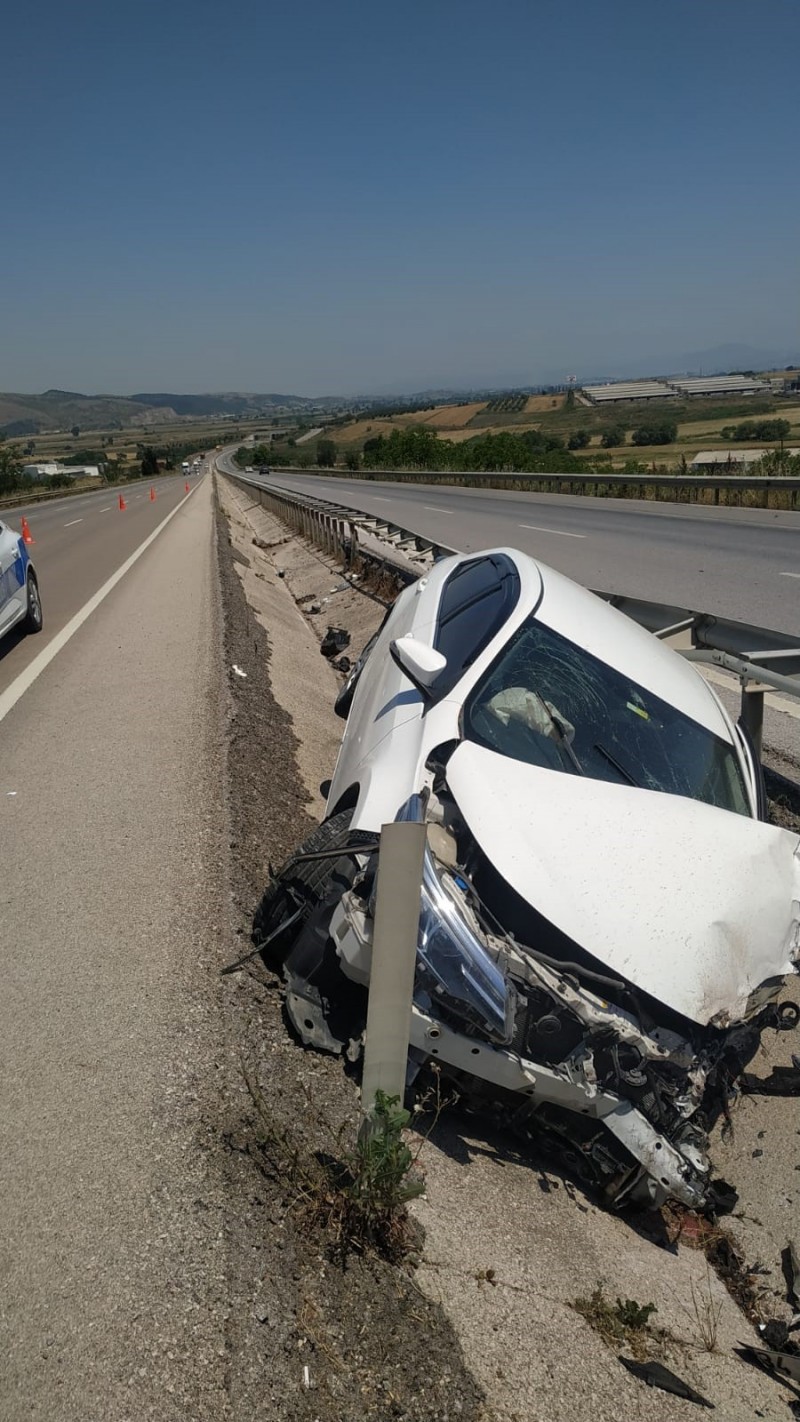Bursa-Balıkesir karayolunda sürücüsünün direksiyon hakimiyetini kaybettiği otomobil refüje çarptı. Kazada 2 kişi yaralandı.