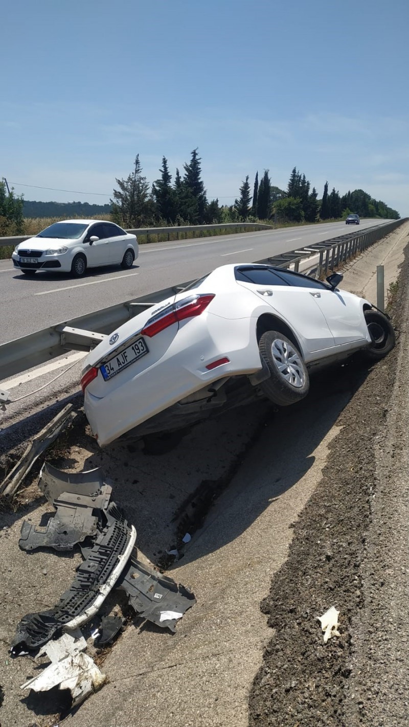 Edinilen bilgiye göre, kaza Bursa-Balıkesir karayolu Karacabey mevkiinde meydana geldi. Bursa istikametinden Balıkesir istikametine seyreden Mehmet K. (57) idaresindeki 34 AJF 193 plakalı otomobil, yolun 91’inci kilometresinde sürücünün direksiyon hakimiyetini kaybetmesi sonucu refüje çarptı. Kaza ihbarı üzerine olay yerine polis, jandarma ve sağlık ekipleri sevk edildi. Kazada sürücü Mehmet K. ile yanında bulunan Suzan K. (57) yaralandı. Olay yerinde ilk müdahaleleri yapılan yaralılar Mustafakemalpaşa Devlet Hastanesi'nde müşahede altında alınırken, hayati tehlikelerinin bulunmadığı öğrenildi. (İHA)