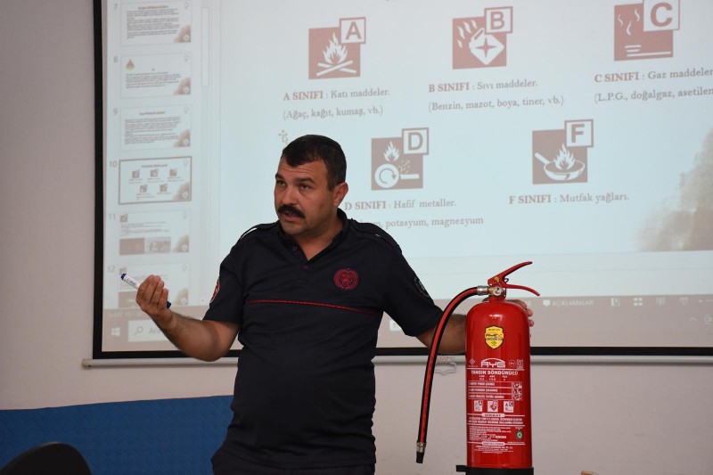 Yangın ile ilgili bilinmeyenleri ve hayat kurtaran detayları personelle paylaşan eğitmen Cihan Salı ‘Yangınların yüzde 98’i insan eliyle yüzde 2’lik kısmı ise doğal sebeplerden meydana gelmektedir. Bilinenin aksine yangınlar ilk 5 dakika içinde müdahale edildiği takdirde büyük felaketlere yol açmaz. Ancak yangın anında insanlar yangını söndürebileceklerini düşündükleri için 112’yi aramayı ihmal ediyorlar. Bundan dolayı itfaiye geç aranıyor ve yangına müdahale gecikiyor. Hâlbuki yangın ilk çıktığı anda 112’yi arasalar yangının kontrol altına alınma oranı çok yüksek olacak.’ diye konuştu. Yangın söndürme esnasında doğru yöntemin kullanılmasının da en az erken müdahale kadar önemli olduğunu dile getiren Salı, uygulanacak küçük bir detayın bile büyük bir felaketi önleyeceğini vurguladı.
