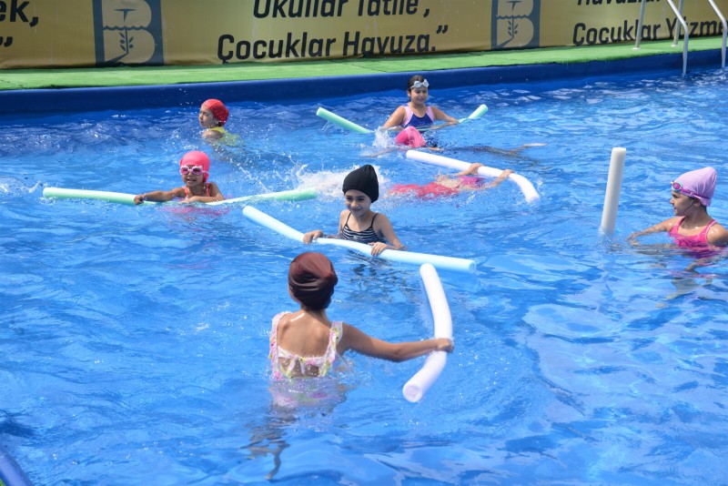 Büyükşehir Belediyesi ile Gençlik ve Spor İl Müdürlüğü iş birliğinde ilçelerde faaliyete alınan havuzlarda çocuklar; hem en iyi şekilde yüzme öğreniyor hem de doyasıya eğleniyor.