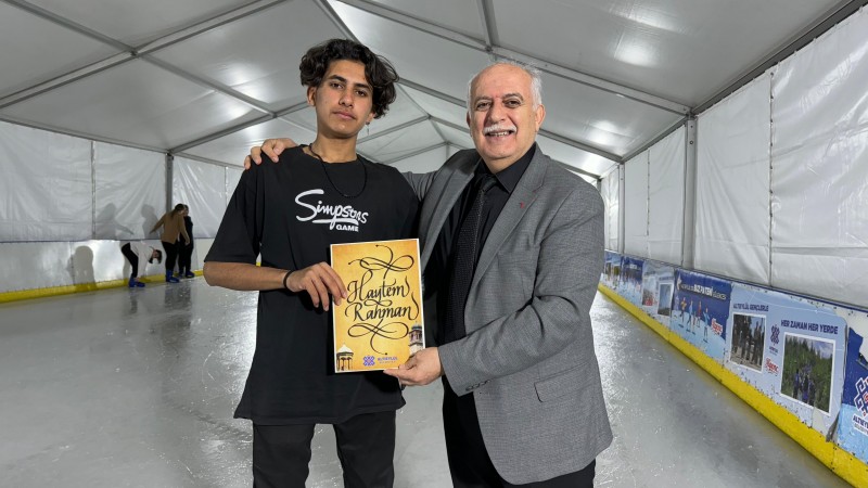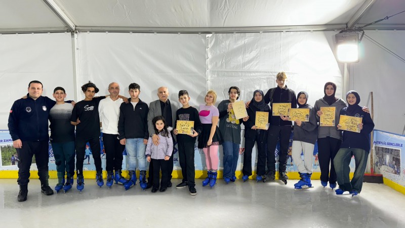 Buz pateni eğlencesinde gönüllü olarak paten kaymayı bilmeyen çocuklara eğitmenlik yapanlara Altıeylül Belediyesi Gençlik Spor Hizmetleri Müdürü Abdüllatif Özer tarafından isimlerine özel hat çalışması hediye edildi.