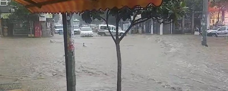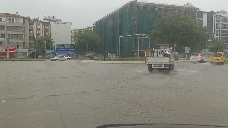 Balıkesir'in Edremit ilçesinde öğle saatlerinde havanın kapanması ile başlayan sağanak yağmur yolları göle çevirdi.