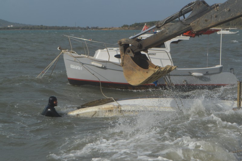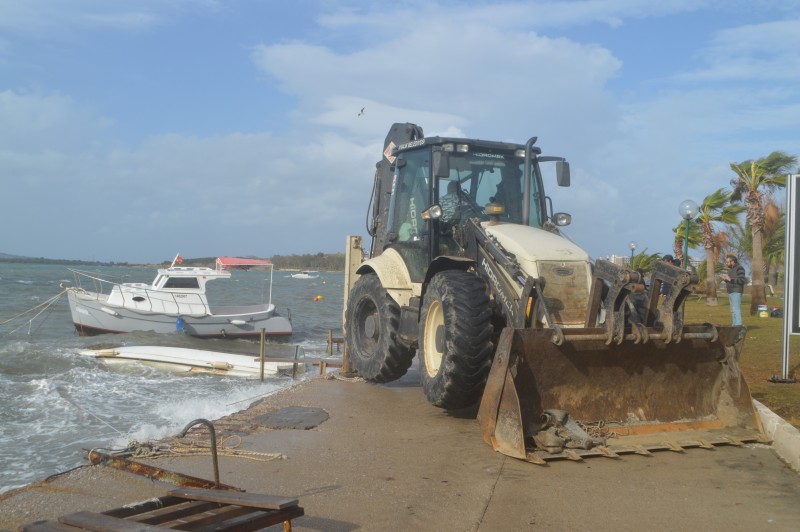 Şiddetli fırtına nedeniyle ilçe merkezindeki Yunus Emre Parkı rıhtımı başta olmak üzere Cunda Adası ile ilçe merkezini birbirine bağlayan Gönül Yolu Köprüsü ile Sahilkent Mahallesi sahil şeridindeki batan küçük balıkçı tekneleri, Ayvalık Belediyesi Fen İşleri Müdürlüğü bünyesindeki iş makineleriyle karaya çıkartılarak parçalanmaktan kurtarıldı.