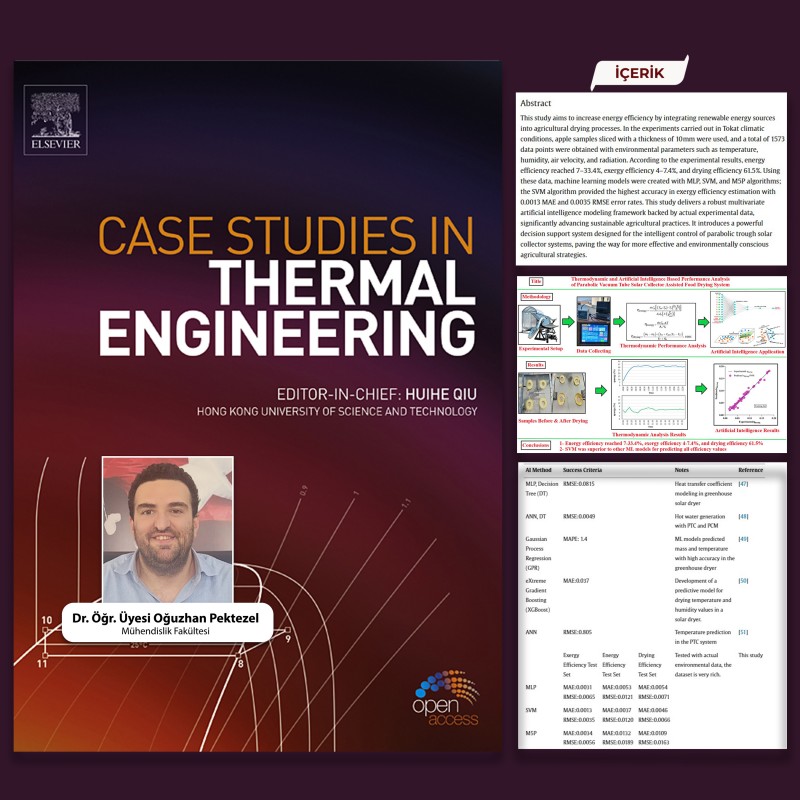 BAÜN akademisyenlerinden Dr. Öğr. Üyesi Oğuzhan Pektezel, Fırat Üniversitesi akademisyenlerinden Prof. Dr. Ebru Akpinar, Doç. Dr. Mehmet Daş ve Tokat Gaziosmanpaşa Üniversitesi akademisyenlerinden Dr. Öğr. Üyesi Mithat Şimşek tarafından ortaya koyulan “Thermodynamic and Artificial Intelligence-Based Performance Analysis of Parabolic Vacuum Tube Solar Collector Assisted Greenhouse Drying System” başlıklı çalışma, uluslararası dergi sıralamalarında en üst dilim olan Q1 ölçeğindeki “Case Studies in Thermal Engineering” dergisinde yayımlandı.
