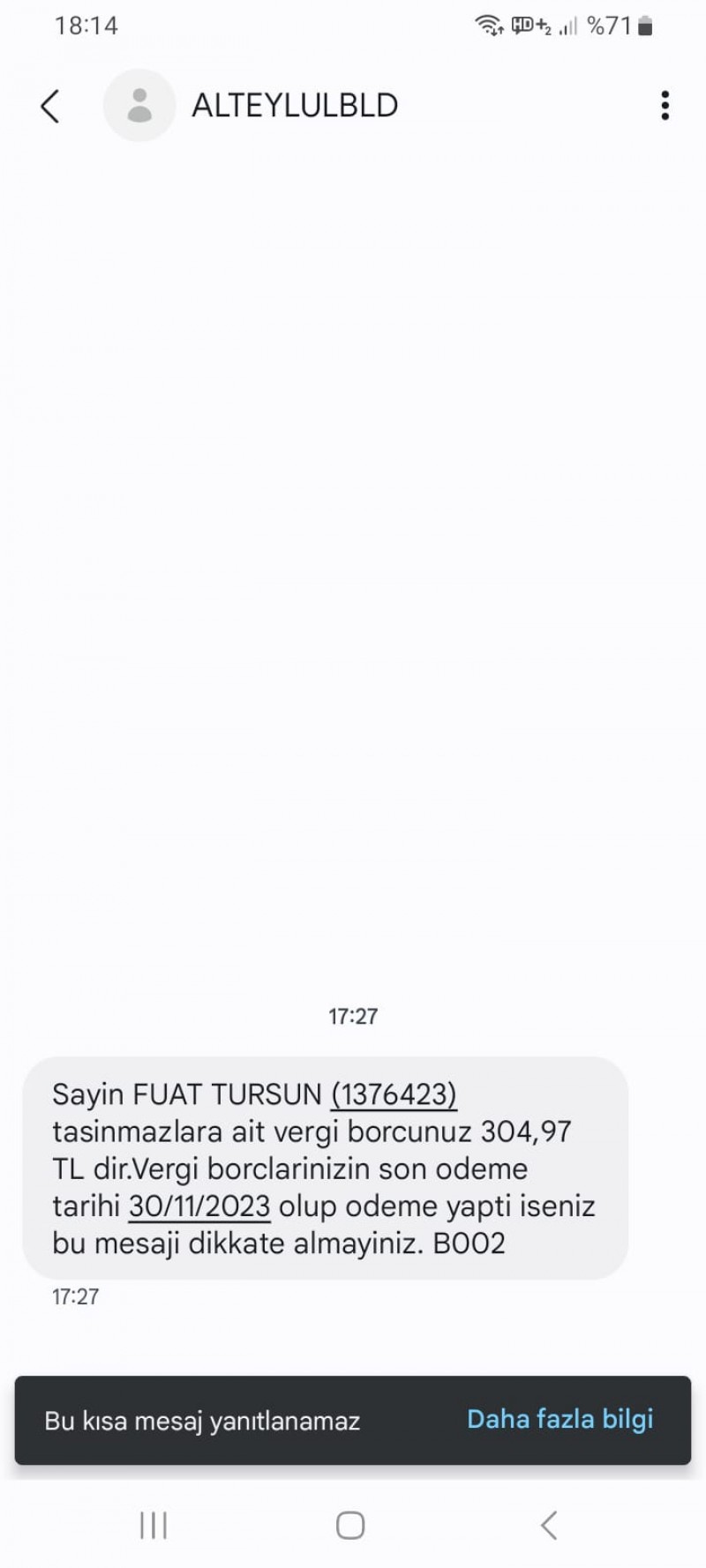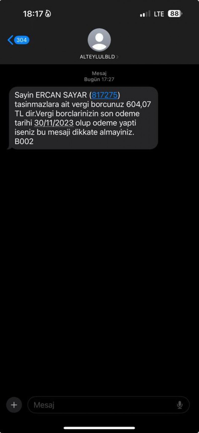 Bu adamın yaptıklarına akıl sır ermiyor... Tam seçim üstü vatandaşlardan haraç keser gibi vergi parası toplamaya çalışan Hasan Avcı'ya tepki yağıyor... Geçtiğimiz gün Altıeylül'de yaşayan vatandaşların telefonları belediye tarafından mesaj yağmuruna tutuldu. Gelen mesajda "Belediyeye olan borçlarınızı ödeyin" yazıyor. Hasan Avcı ve ekibi hangi akla hizmet bu mesajları gönderdi bilemiyoruz... Bildiğimiz tek bir şey var; Hasan'ın Ak Parti'ye verdiği zararı başka kimse veremez.. Devam et Hasan! (Necdet Pekmezci)