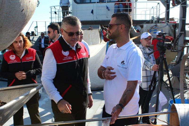 Balıkesir İl Tarım ve Orman Müdürü Erkan Alkan, "Balıkesir tarım ve hayvancılık potansiyeli yönünden çok yüksek bir ilimiz. Büyükbaş hayvan yetiştiriciliğinden tutun kanatlı yetiştiriciliğine, küçükbaş hayvan yetiştiriciliğine, su ürünleri potansiyelimize çok yüksek bir potansiyele sahip bir ilimiz. Özellikle Balıkesir'de Türkiye'nin en büyük balıkçı gemisi filosu var. Şu an Türkiye´de 1.ciyiz. Su ürünleri üretimi açısından da şu an potansiyelimiz çok yüksek. Özellikle 2021 yılında görülen müsilaj sonrası midye yetiştiriciliği tesislerimizin arttırılması yönünde ciddi şekilde bir hız verdik. Bir midye 2 ile 100 mikron aralığında ki parçacıkları süzerek bununla besleniyor. 7-8 santimetre büyüklüğündeki bir midye yaklaşık 10-15 litre suyu süzmektedir. Bu açıdan baktığınız zaman bir kilogram midye yaklaşık bin ton süyü süzmesi demektir ki bu 1 saat içerisinde gerçekleşiyor. Sadece şu an Balıkesir ilimiz Erdek ilçemiz Çakıl mahallemizde Fener adası mevkindeyiz. Ve sadece burada 2 bin ton midye üretilmekte. Ve özellikle midye yetiştiriciliği yapılan yerlerde doğal resif olmaktadır ki şimdiye kadar görülmemiş balıklar, canlılar o midye yetiştiriciliği yapılan yerin altında bulunmaktadır" dedi.