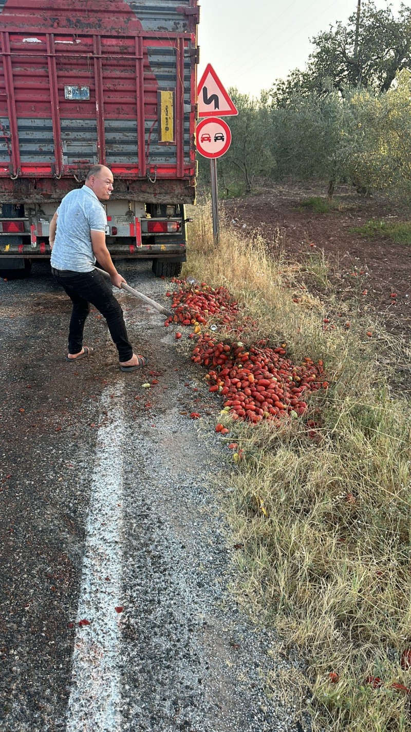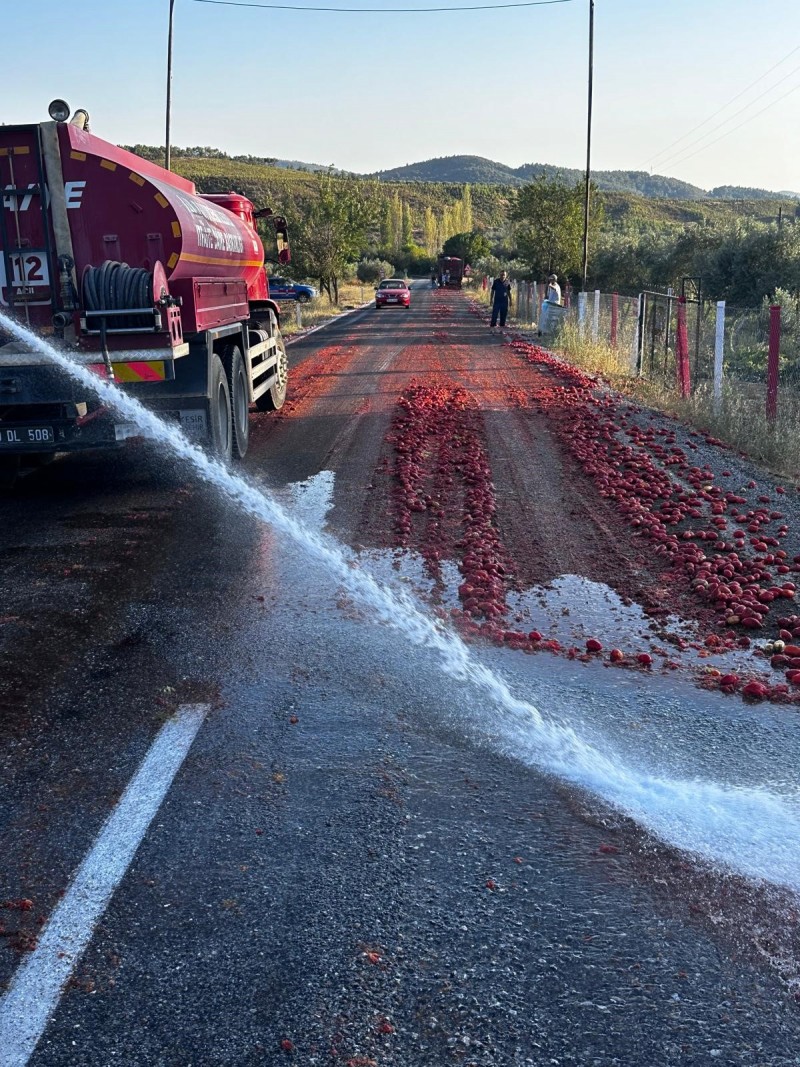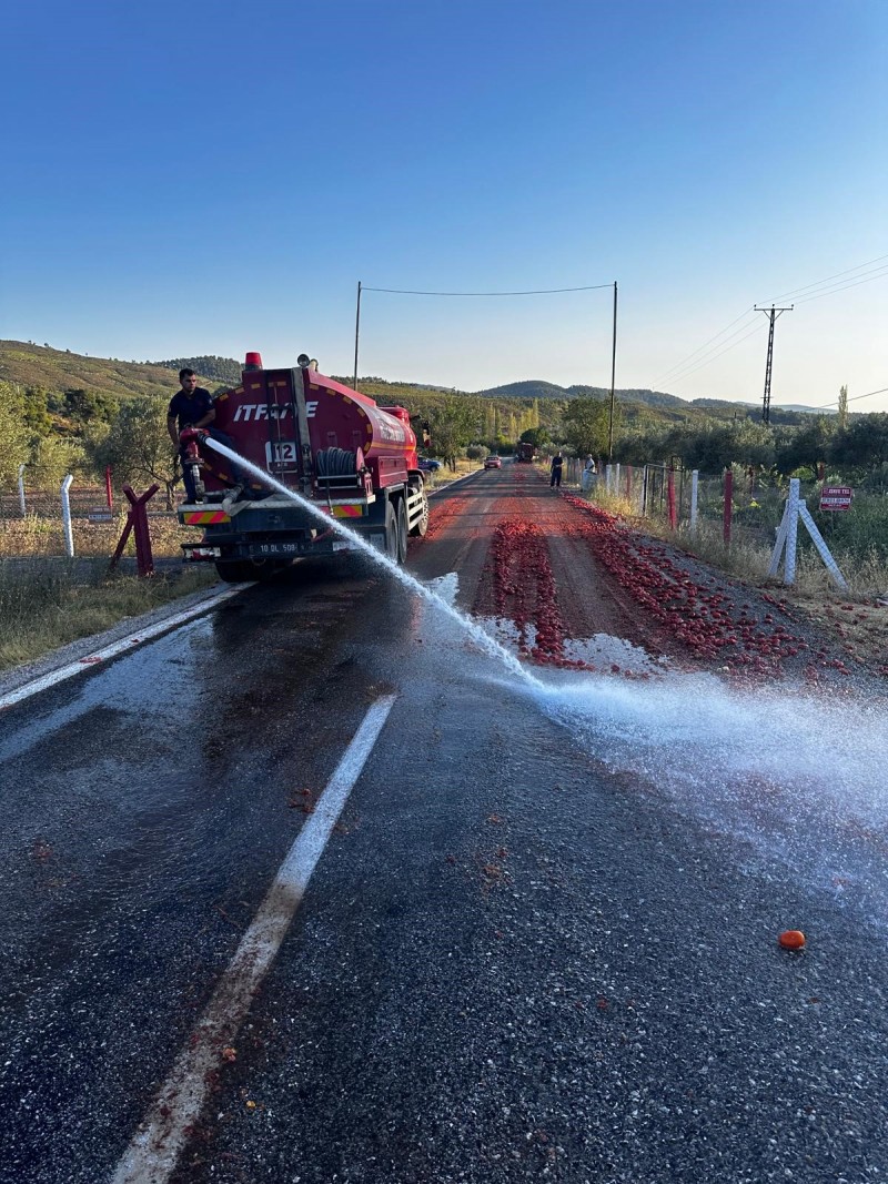 İzmir ve Muğla'da çıkan orman yangınlarının söndürülmesi için bölgeye giden Balıkesir itfaiyesi, yangınların söndürülmesinin ardından geri dönüşte Balıkesir-Manisa yolunda bir kamyondan yola saçılan domatesleri de temizledi.