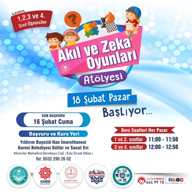 Karesi Belediyesi ve Balıkesir Üniversitesi işbirliği ile geleneksel hale gelen Akıl ve Zeka Oyunları Atölyesi başlıyor. Son başvuru süresinin 16 Şubat’ta sona ereceği kursların ilk dersi 18 Şubat Pazar günü yapılacak.