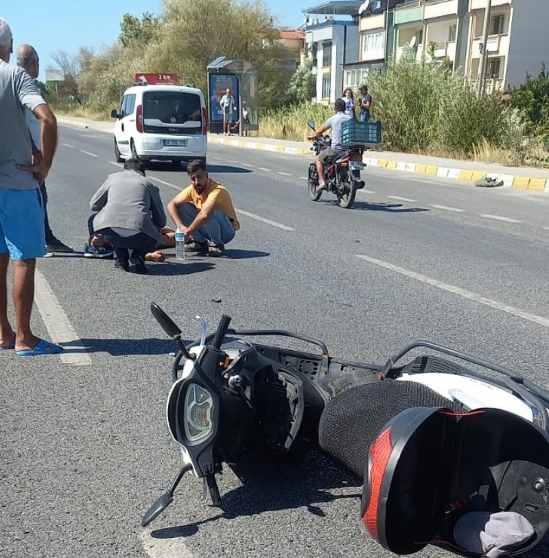 Edremit ilçesinde motosiklet ile aracın çarpıştığı kazada, ağır yaralanan motosiklet sürücüsünün yardımına çevredekiler koştu.