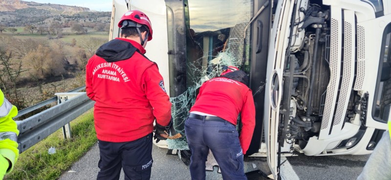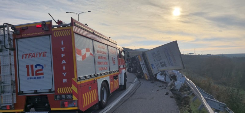 İstanbul-İzmir Otoyolu Yeniköy kuzey Gişeler Bağlantı yolunda saat 15:55 sularında meydana gelen trafik kazasında 31 KK 940 plakalı çekici ve arkasına bağlı 31 KK 307 plakalı dorsenin yan yatması sonucu araç sürücüsü H.Ş. araç içerisinde mahsur kaldı. Olaya Balıkesir İtfaiyesi 1 araç ve 5 personelle müdahale etti. Araç sürücüsü H.Ş. mahsur kaldığı yerden yaralı bir şekilde çıkarılıp 112 sağlık ekiplerine teslim edildi.