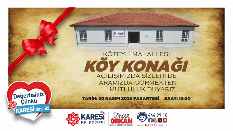 Kırsal mahallelerin 'köy odası' geleneğini inşa ettiği modern köy konakları ile gelecek kuşaklara aktaran Karesi Belediyesi, Köteyli ve Aktarma Mahalleleri’nin köy konaklarını açmak için gün sayıyor. İlk olarak 20 Kasım Pazartesi günü Köteyli Köy Konağı hizmete alınacak.