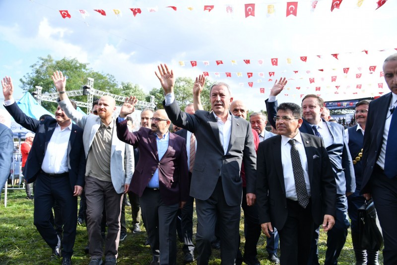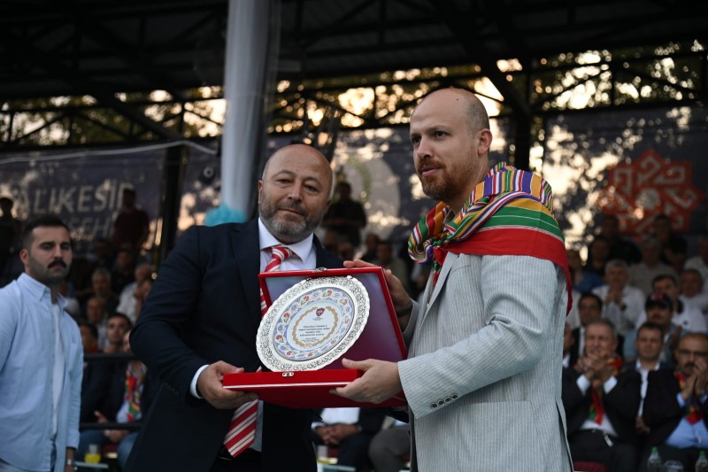 Etkinliğe katılan Dünya Etnospor Konfederasyonu Başkanı Bilal Erdoğan ve Milli Savunma eski bakanı Hulusi Akar, final karşılaşması öncesi güreşçilerin yanına giderek başarı dilediler.