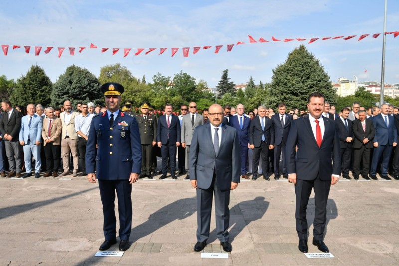 Kutlama programları kapsamında ilk olarak Atatürk Anıtına Çelenk Sunma Töreni gerçekleştirildi. Törende Vali İsmail Ustaoğlu, Garnizon Komutanı Hava Pilot Tuğgeneral Cihangir Kemal Yüzçelik ve Büyükşehir Belediye Başkanı Yücel Yılmaz Atatürk Anıtına çelenk sundular. Çelenklerin sunulmasının ardından Saygı Duruşu ve İstiklal Marşının okunması ile buradaki tören sona erdi.