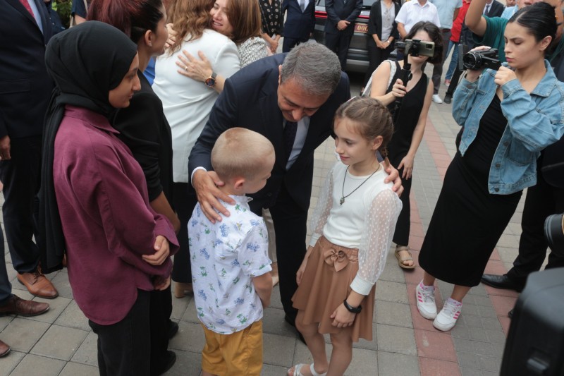 Vali Hasan Şıldak ve eşi Fatma Nur Şıldak konuşmanın ardından kendilerini uğurlamaya gelenlerle tek tek vedalaştı. (İHA)