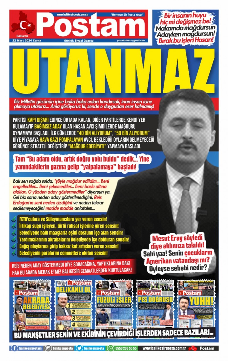 Partisi kapı dışarı edince ortada kalan, diğer partilerde kendi yer bulamayıp bağımsız aday olan Hasan Avcı şimdilerde mağduru oynamaya başladı. İlk günlerde “40 bin alıyorum”, “50 bin alıyorum” diye piyasaya hava gazı pompalayan Avcı, beklediği oyların gelmeyeceği görünce strateji değiştirip “MAĞDUR EDEBİYATI” yapmaya başladı.