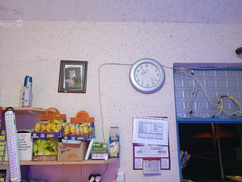 Öte yandan bölgede uzun yıllardır esnaflık yapan Hasan Şimşek, duvarları simsiyah bürüyen sinekleri görüntüledi.