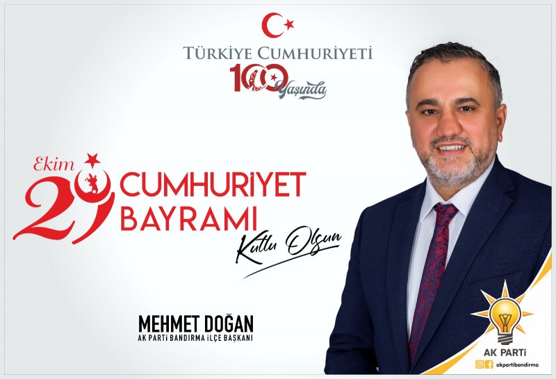Ak Parti Bandırma İlçe Başkanı Mehmet Doğan Cumhuriyetimizin 100. Yılı dolayısıyla kutlama mesajı yayınladı. Doğan; “Büyük bir heyecanla kavuştuğumuz Gazi Mustafa Kemal Atatürk’ün emaneti Cumhuriyetimizin 100. Yılı Kutlu Olsun” dedi.