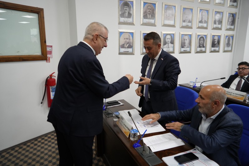 Belediye Başkanı Mehmet Ertaş gündem maddelerine geçmeden önce meclis üyelerini tek tek tebrik ederek meclis üyesi rozeti hediye etti.