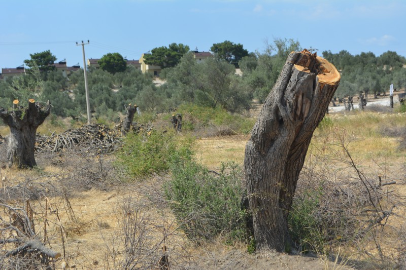 Gömeç ilçesinin Keremköy Mahallesi’nde binlerce zeytin ağacı adeta katledilerek, yerine lüks villalar dikiyor.