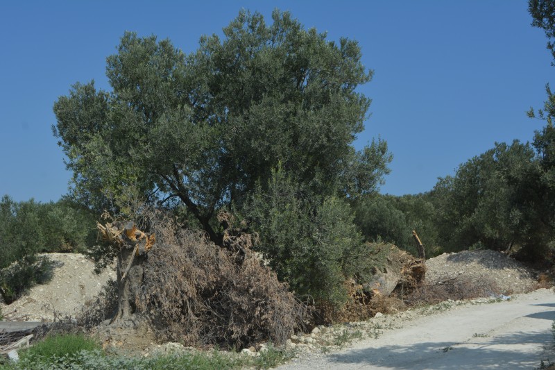 Gövdelerinden ayrılmış bir şekilde budanmış bir görünüm verilen bir zeytinlik alanda ise zemin etüt makinesinin bulunması neredeyse her şeyi ortaya döküyor.