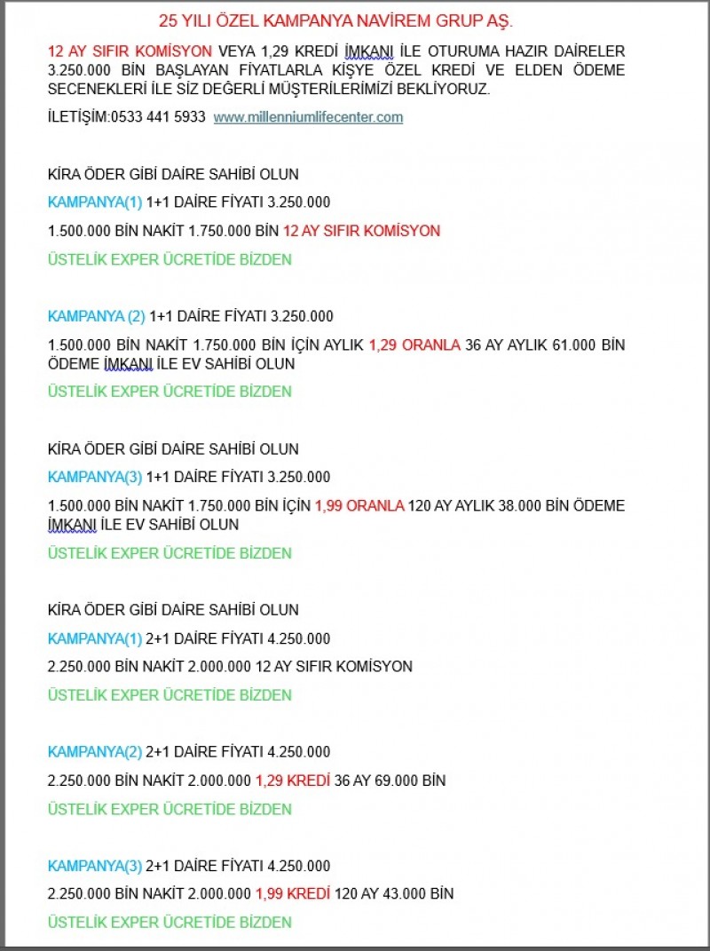 Balıkesir’de 25 yıllık inşaat tecrübesine sahip Navirem Grup A.Ş., Millennium Rezidans projesinde oturuma hazır 1+1 ve 2+1 daireleri 3 milyon 250 bin TL’den başlayan fiyatlarla satışa sundu.