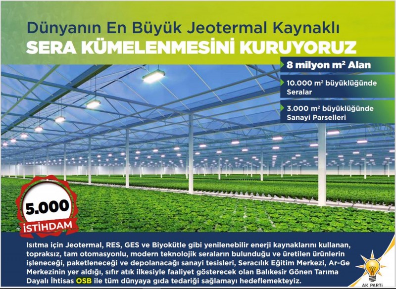 “Şehir Ekonomisi ve İstihdam” projelerini açıklayan Balıkesir Büyükşehir Belediye Başkanı Yücel Yılmaz, Balıkesir’in çocuklarının, Balıkesir’de doyacakları birçok Organize Sanayi Bölgesi ve sanayi sitesi kurulacağını müjdeledi. Bigadiç ve Edremit’te Tarıma Dayalı İhtisas OSB, Gönen Sera İhtisas OSB, Balıkesir OSB Genişleme Etabı, Marmara OSB Genişleme Etabı, Dursunbey OSB, Susurluk Besi İhtisas OSB’leri, Bakanlıkla beraber yapacaklarını söyleyen Başkan Yücel Yılmaz, arsa tahsis sözleşmelerini teslim edeceklerini de ifade etti. Jeotermal Sera ve Otel, Galericiler Sitesi, Gökköy Sanayi Sitesi ve Marmara Sanayi Sitesi ile birlikte toplamda 25 bin kişiye istihdam sağlanacak.