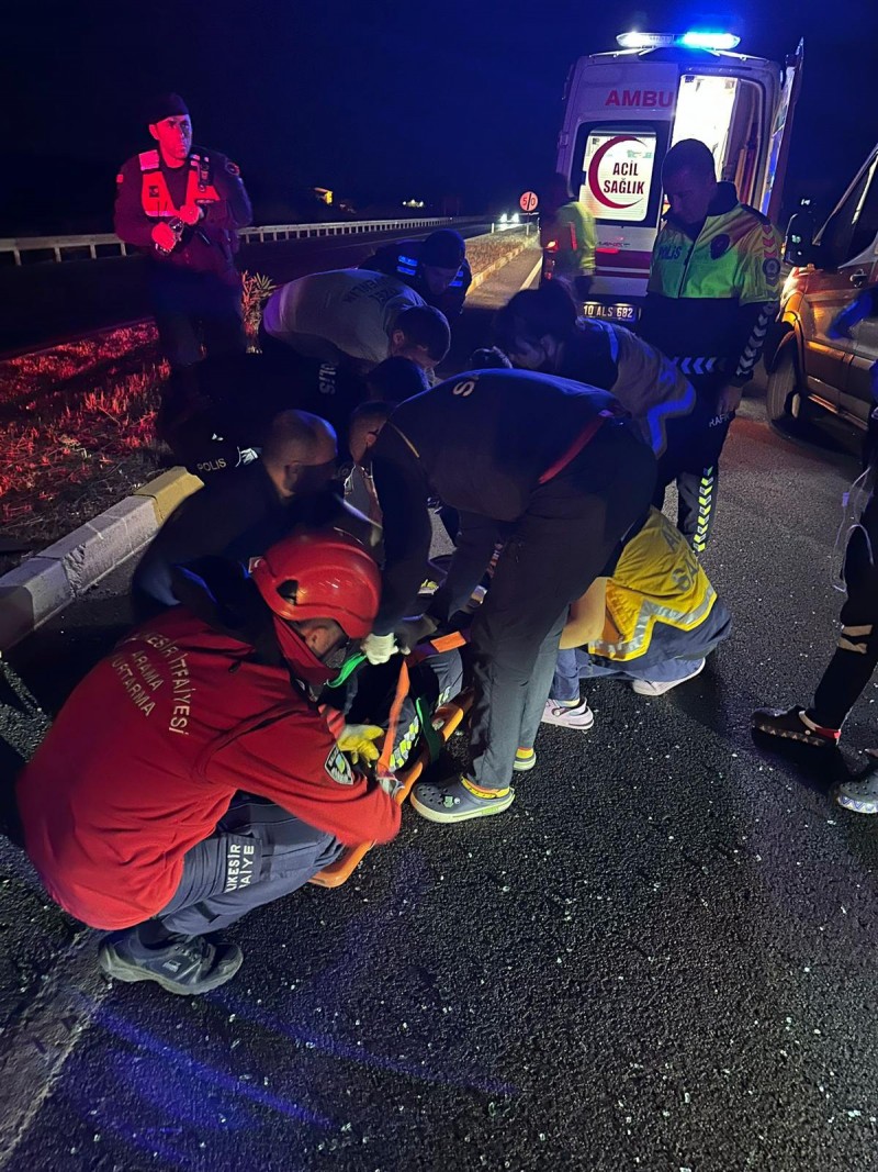 Balıkesir’in Çanakkale-İzmir karayolunda duran polis aracına çarpan sürücü ve yolcu araç içinde sıkışırken, bir polis memuru yaralandı.