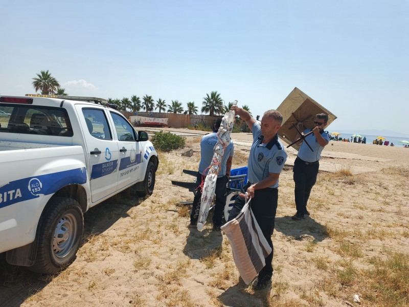 Balıkesir Büyükşehir Belediyesi Zabıta Daire Başkanlığı, sorumluluk alanında bulunan sahil şeritlerinde hem görüntü kirliliğine sebep olan hem de tatilcilerin yaşamasına engel olan etkenleri ortadan kaldırmaya devam ediyor. Vatandaşın rahat etmesi için var gücüyle çalışan Büyükşehir Belediyesi’nin zabıta ekipleri tarafından sürekli uyarılan fakat kullanmadıkları halde sahilleri işgal eden malzemeleri toplamaya başladı. Gece ve gündüz bırakılan bisiklet kilitleri ve zincir ile kilitlenerek sabit bırakılan şemsiye, şezlong, kamp sandalyesi vb. eşyalar toplanarak sahilden uzaklaştırıldı. Denetimlerin süreceğini dile getiren Balıkesir Büyükşehir Belediyesi Zabıta Daire Başkanı Bülent Mavuk, “Sahillerdeki işgallere yönelik denetimlerimiz devam ediyor. Vatandaşlarımızın konforlu ve rahat bir tatil geçirmesi için ekiplerimizle birlikte çalışmalarımızı sürdürüyoruz.” dedi.