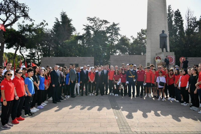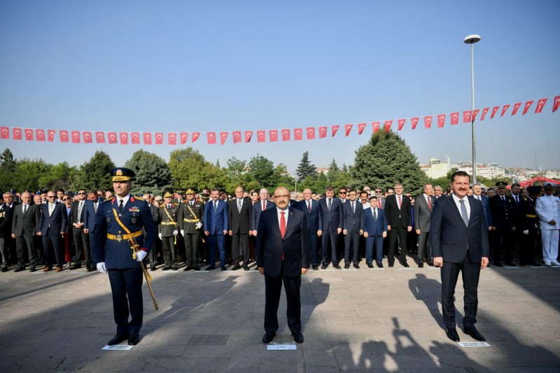 Kutlama programları kapsamında ilk olarak Atatürk Anıtına Çelenk Sunma Töreni gerçekleştirildi. Törende Vali İsmail Ustaoğlu, Garnizon Komutanı ve 9’uncu Ana Jet Üs Komutanı Hv.Plt.Tuğg. Cihangir Kemal Yüzçelik ve Büyükşehir Belediye Başkanı Yücel Yılmaz Atatürk Anıtına çelenk sundular. Çelenklerin sunulmasının ardından düzenlenen tören, saygı duruşu ve İstiklal Marşının okunması ile sona erdi.