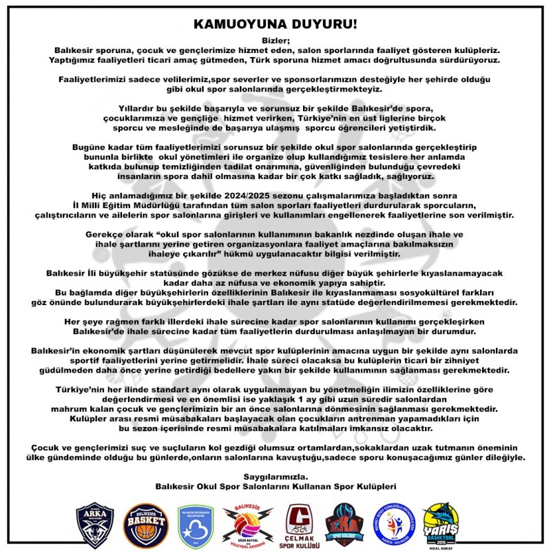 İl Milli Eğitim faaliyetleri durdurdu iddiası Açıklamalarını sürdüren spor kulüpleri, “Hiç anlamadığımız bir şekilde 2024/2025 sezonu çalışmalarımıza başladıktan sonra İl Milli Eğitim Müdürlüğü tarafından tüm salon sporları faaliyetleri durdurularak sporcuların, çalıştırıcıların ve ailelerin spor salonlarına girişleri ve kullanımları engellenerek faaliyetlerine son verilmiştir. Gerekçe olarak “okul spor salonlarının kullanımının bakanlık nezdinde oluşan ihale ve ihale şartlarını yerine getiren organizasyonlara faaliyet amaçlarına bakılmaksızın ihaleye çıkarılır” hükmü uygulanacaktır bilgisi verilmiştir. Balıkesir İli büyükşehir statüsünde gözükse de merkez nüfusu diğer büyük şehirlerle kıyaslanamayacak kadar daha az nüfusa ve ekonomik yapıya sahiptir. Bu bağlamda diğer büyükşehirlerin özelliklerinin Balıkesir ile kıyaslanmaması sosyokültürel farkları göz önünde bulundurarak büyükşehirlerdeki ihale şartları ile aynı statüde değerlendirilmemesi gerekmektedir. Her şeye rağmen farklı illerdeki ihale sürecine kadar spor salonlarının kullanımı gerçekleşirken Balıkesir’de ihale sürecine kadar tüm faaliyetlerin durdurulması anlaşılmayan bir durumdur. Türkiye’nin her ilinde standart aynı olarak uygulanmayan bu yönetmeliğin ilimizin özelliklerine göre değerlendirmesi ve en önemlisi ise yaklaşık 1 ay gibi uzun süredir salonlardan mahrum kalan çocuk ve gençlerimizin bir an önce salonlarına dönmesinin sağlanması gerekmektedir. Kulüpler arası resmi müsabakaları başlayacak olan çocukların antrenman yapamadıkları için bu sezon içerisinde resmi müsabakalara katılmaları imkansız olacaktır. Çocuk ve gençlerimizi suç ve suçluların kol gezdiği olumsuz ortamlardan, sokaklardan uzak tutmanın öneminin ülke gündeminde olduğu bu günlerde,onların salonlarına kavuştuğu, sadece sporu konuşacağımız günler dileğiyle” ifadelerini kullandı.