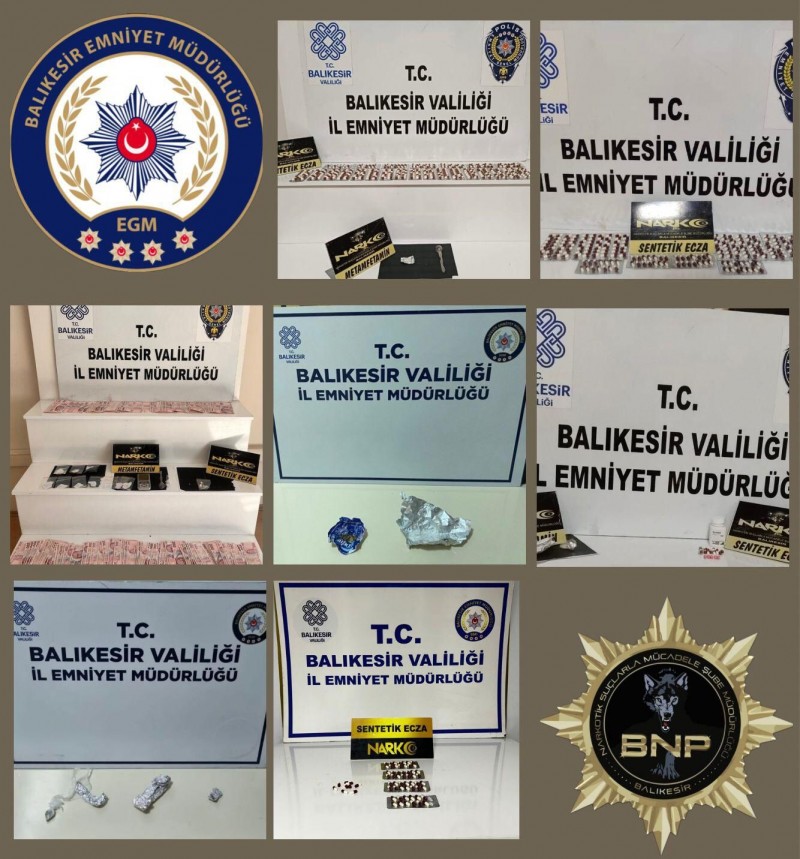 Yürütülen çalışmalar ve eş zamanlı operasyon kapsamında; 586 adet sentetik ecza hap, satışa hazır 11 parça halinde 8,46 gram metamfetamin maddesi, 2 parça halinde 2,29 gram Sentetik Kannabinoid, 7 adet uyuşturucu madde içiminde kullanılan cam aparat, 2 adet hassas terazi ve suçtan elde edildiği değerlendirilen 34.000 TL para ele geçirildi.