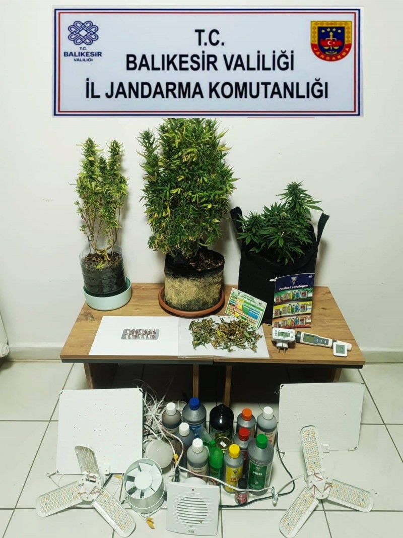 Balıkesir İl Jandarma Komutanlığı 17 Ocak tarihlerinde Altıeylül ilçesinde düzenlenen uyuşturucu madde yapımı ve ticareti suçu işlediği tespit edilen şüphelilerin yakalanması ve suç unsurlarının ele geçirilmesine yönelik operasyonda bir araç ve 2 ikamet adresinde yapılan aramalarda; 297 galara marka sentetik uyuşturucu hap, 3 kök skunk bitkisi, 10 gram kubar esrar, 2.47 gram metamfetamin, 1.21 gram sihirli mantar (magic mushroom), 2.11 gram Kenevir tohum, bir hassas terazi, bir esrar öğütme aparatı, bir iklimlendirme sistemi ve 14 tarımsal ilaç ele geçirildi. Olay karışan 2 şüpheli yakalanarak haklarında adli işlem başlatıldı.