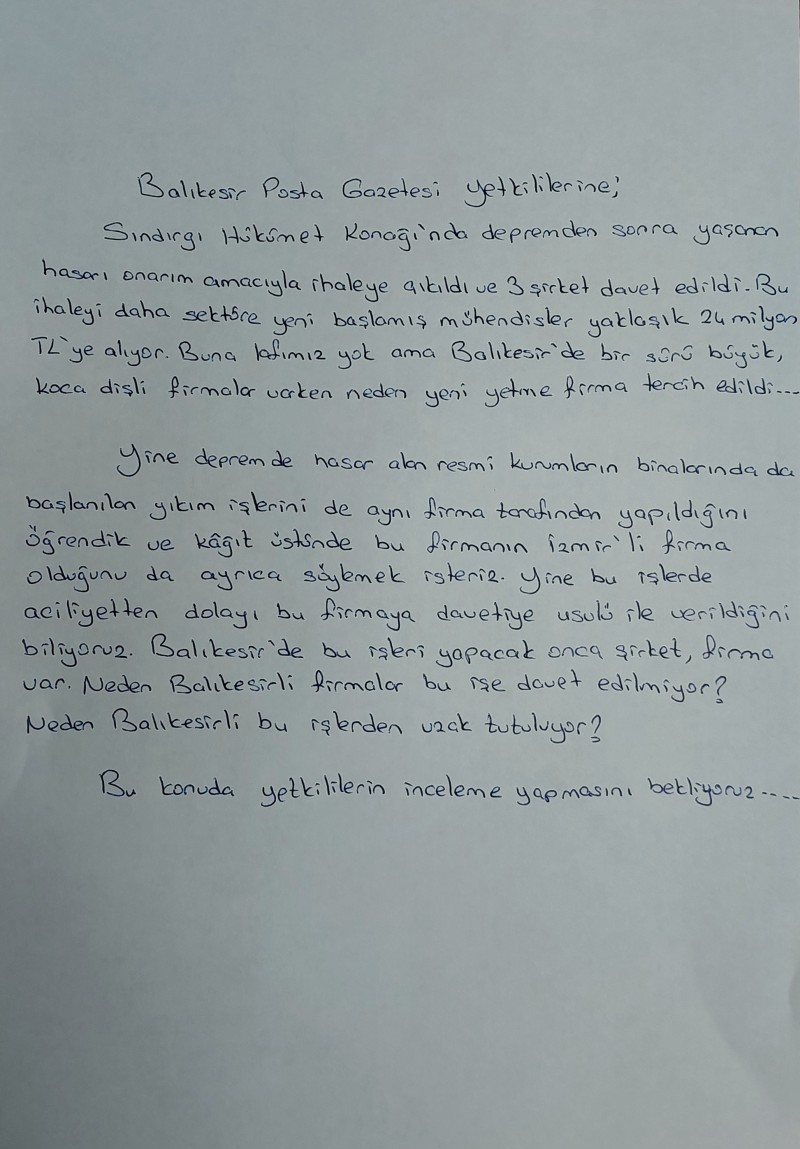 Gazetemize ulaşan bir şikâyet mektubu ve #sizdengelenler ihbar hattımıza ulaşan özellikle son dönem kamu ihalelerinde yaşanan uygulamalara ilişkin ciddi soru işaretlerini Balıkesir Valisi İsmail Ustaoğlu’nun dikkatine sunuyoruz. Biz biliyoruz ki Sayın Vali Ustaoğlu bu konularda son derece hassas, şeffaflıktan yana ve usulsüzlüklere karşı tavizsiz bir isimdir. Bu nedenle hem Balıkesirli firmaların hem de vatandaşların merak ettiği bu konuların en kısa sürede titizlikle inceleneceğine inanıyoruz.