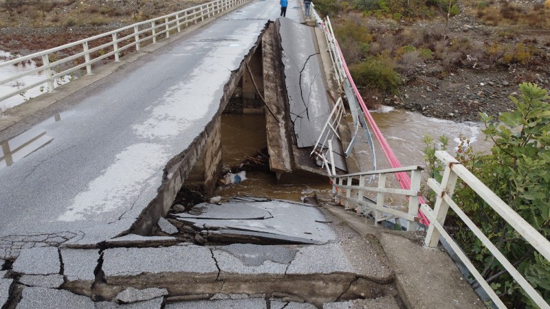 Edremit ilçesindeki Zeytinli Çayı’nın şiddetli yağış sonucu debisinin yükselmesiyle yıkılan köprü, gündüz havadan görüntülendi.
