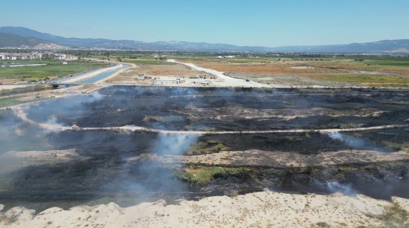 Yangında sazlık alanda büyük zarar meydana geldi. Yanan alan bir süre önce dron kamerası ile böyle görüntülendi. Yangın sonrası ve yangın öncesi çekilen görüntülerde yangının verdiği zarar gözler önüne serildi.